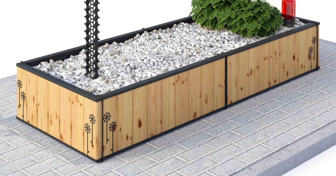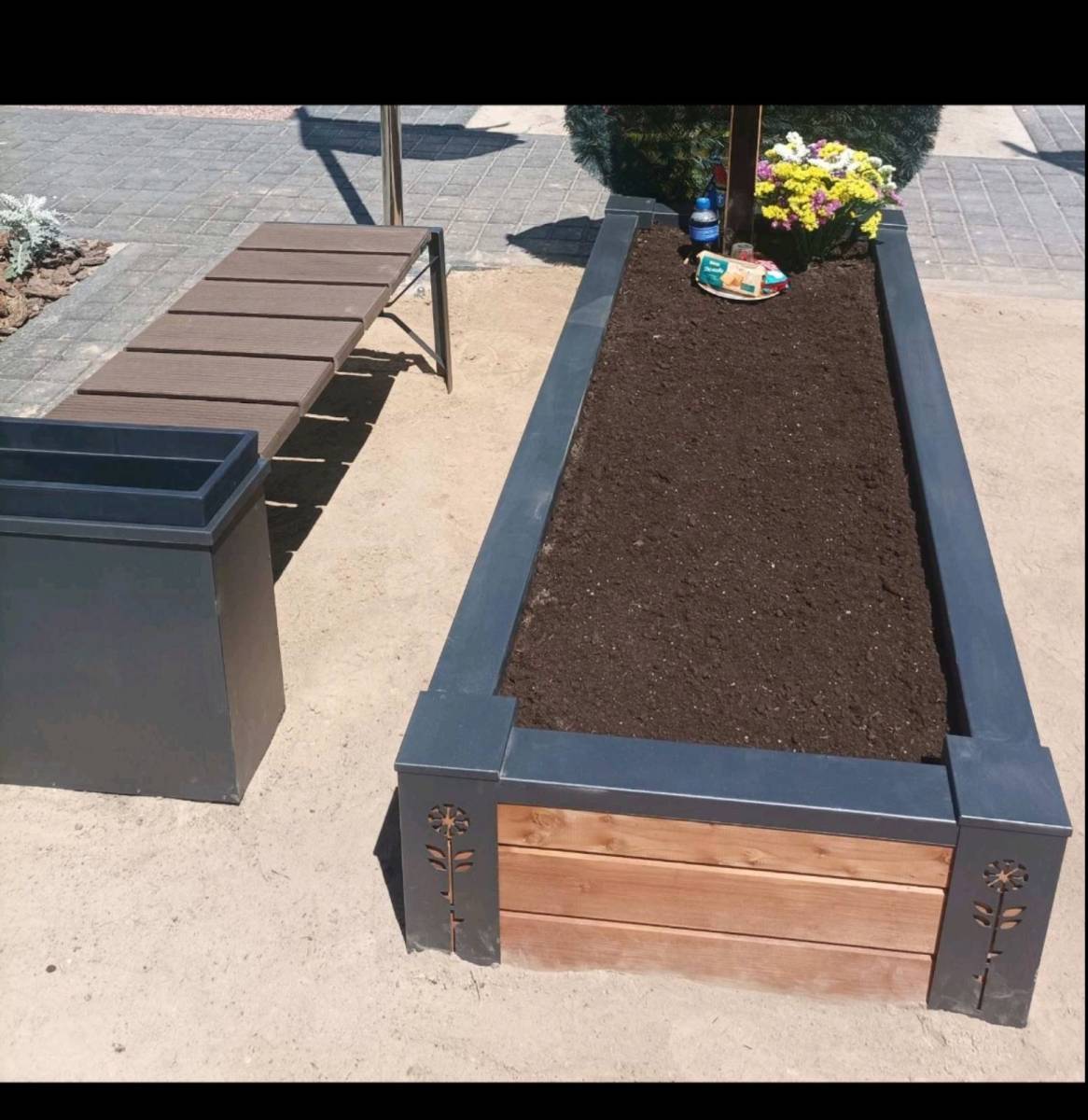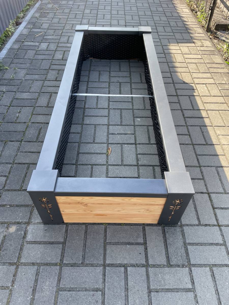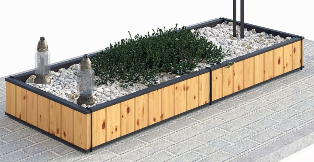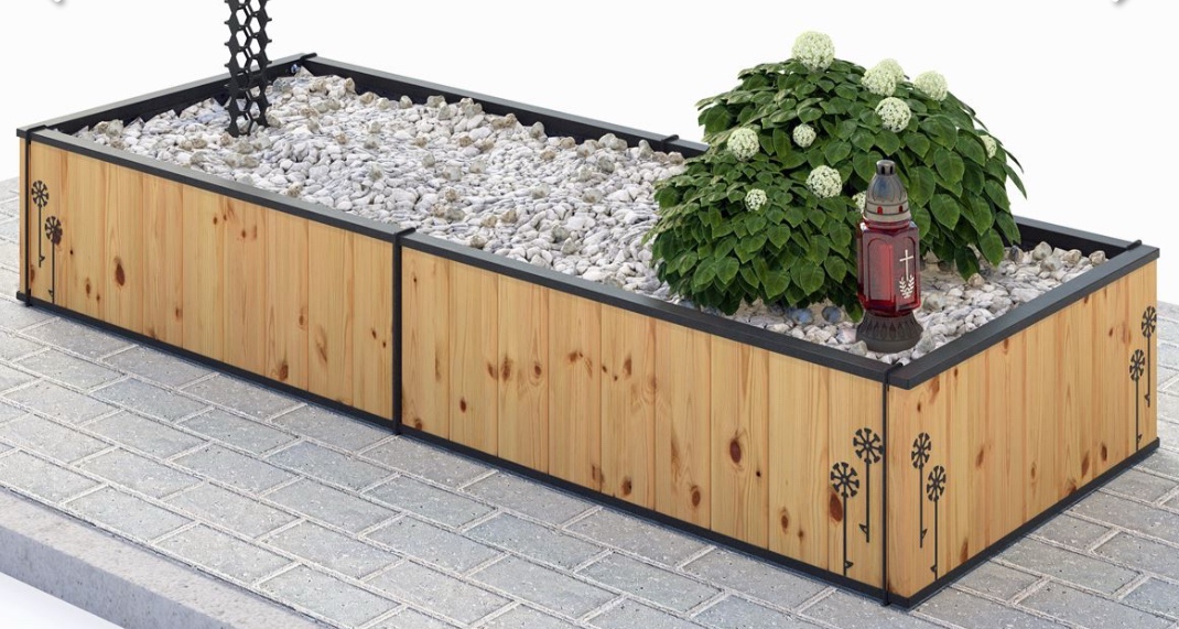 Надгробок деревʼяний одинарний модульний сталь квіти (модрина) складається з шести окремих елементів. Він оснащений металевою рамою, яка обрамляє конструкцію зверху та знизу.